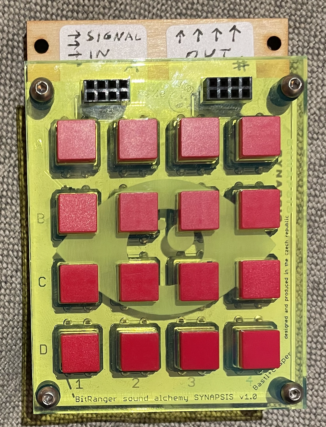 Here you see an LED connected between the Kastle ground socket and the STEPPED socket, which is blinking the pattern that the STEPPED socket is generating. You can also introduce buttons between connections, by making or using something like the Bastl BitRanger Synapsis, which is just a grid of buttons where four signals can be routed to four different outputs by holding down their respective buttons. Makes for very fast re-patching, which vastly increases your options for what you can do with this thing.