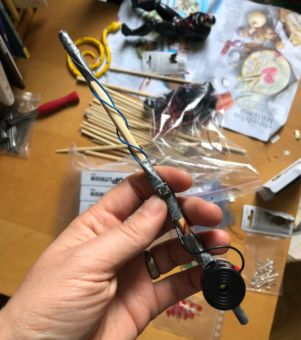 Now try holding the wire to the battery so it's "on", and pointing the end of the chopstick towards different lights. You should hear different sounds.