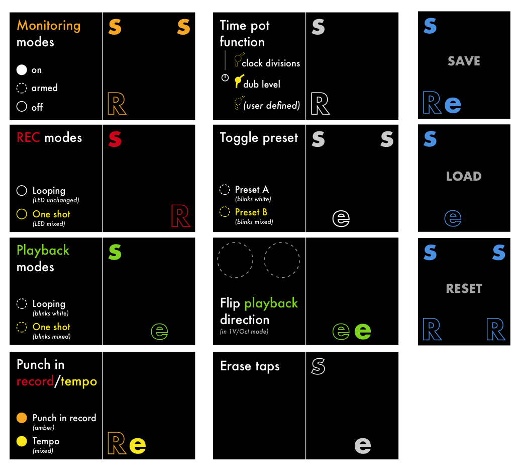I'm always forgetting the button combos on Instruo modules, and even though the full gold on black is gorgeous, I've found adding some color with Befaco bananuts to the inputs and outputs helps me find what I'm looking for at a glance. (green for input, red for output, silver for gate in and gold for clock out)