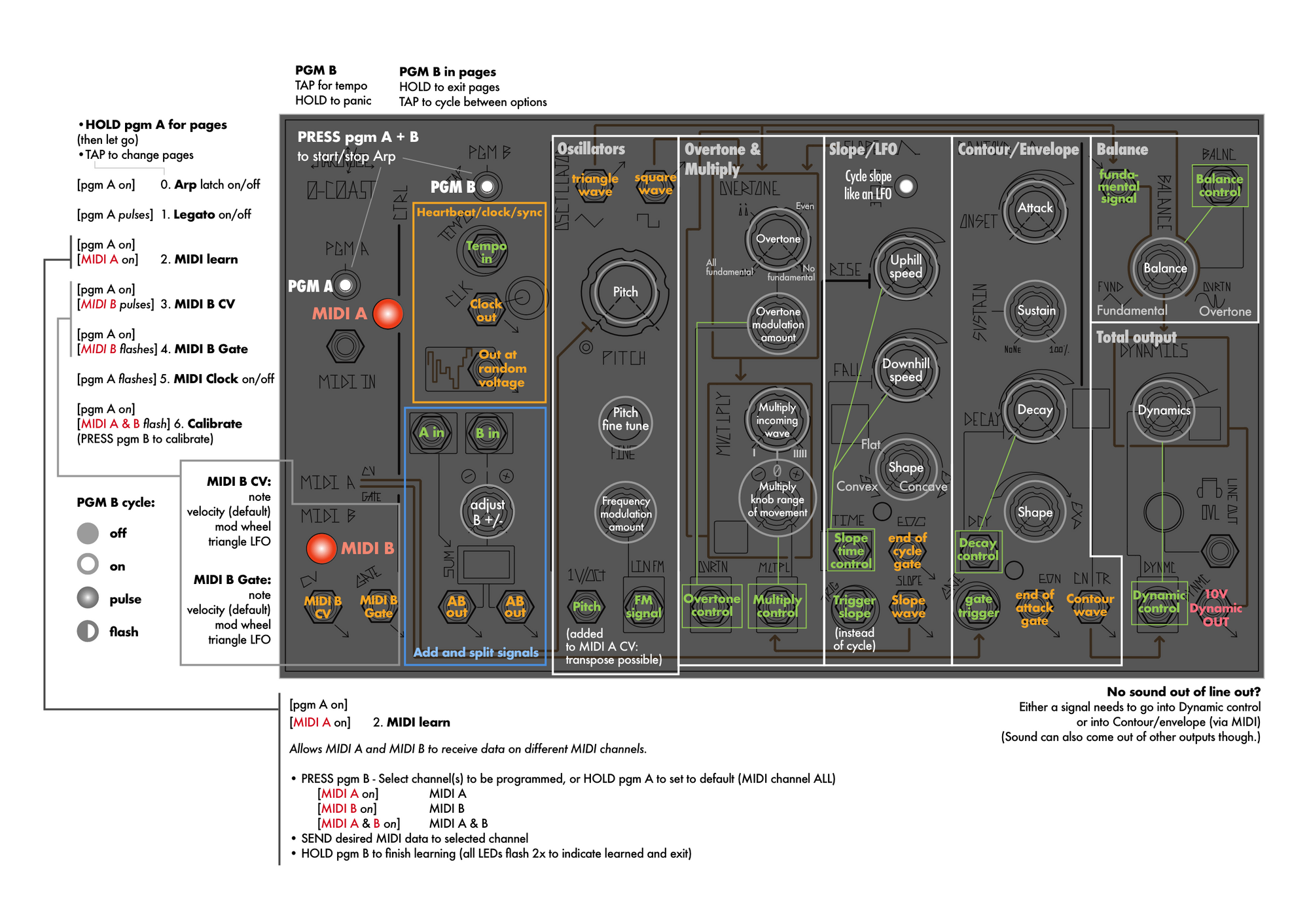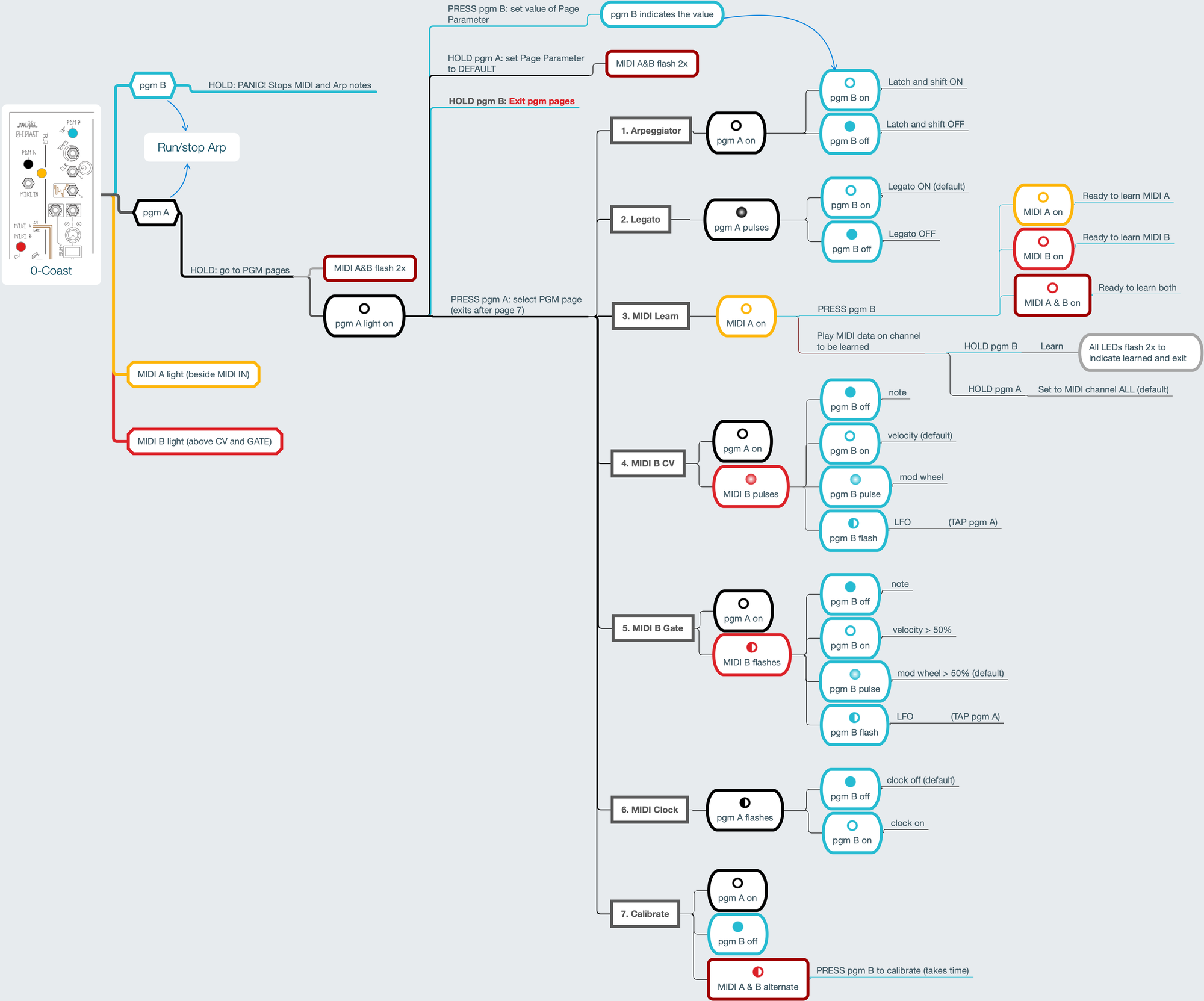 Going deep into the MakeNoise 0-Coast , I found myself squinting at the PGM commands on the back of the unit and generally wanting an overall reference for this thing so I could remember details later. Made these cheatsheets for myself. I'm using intentionally non-technical language (The official manual has plenty of that if you really want to get into this). May contain mistakes, but maybe also helps some of you get your heads around this.