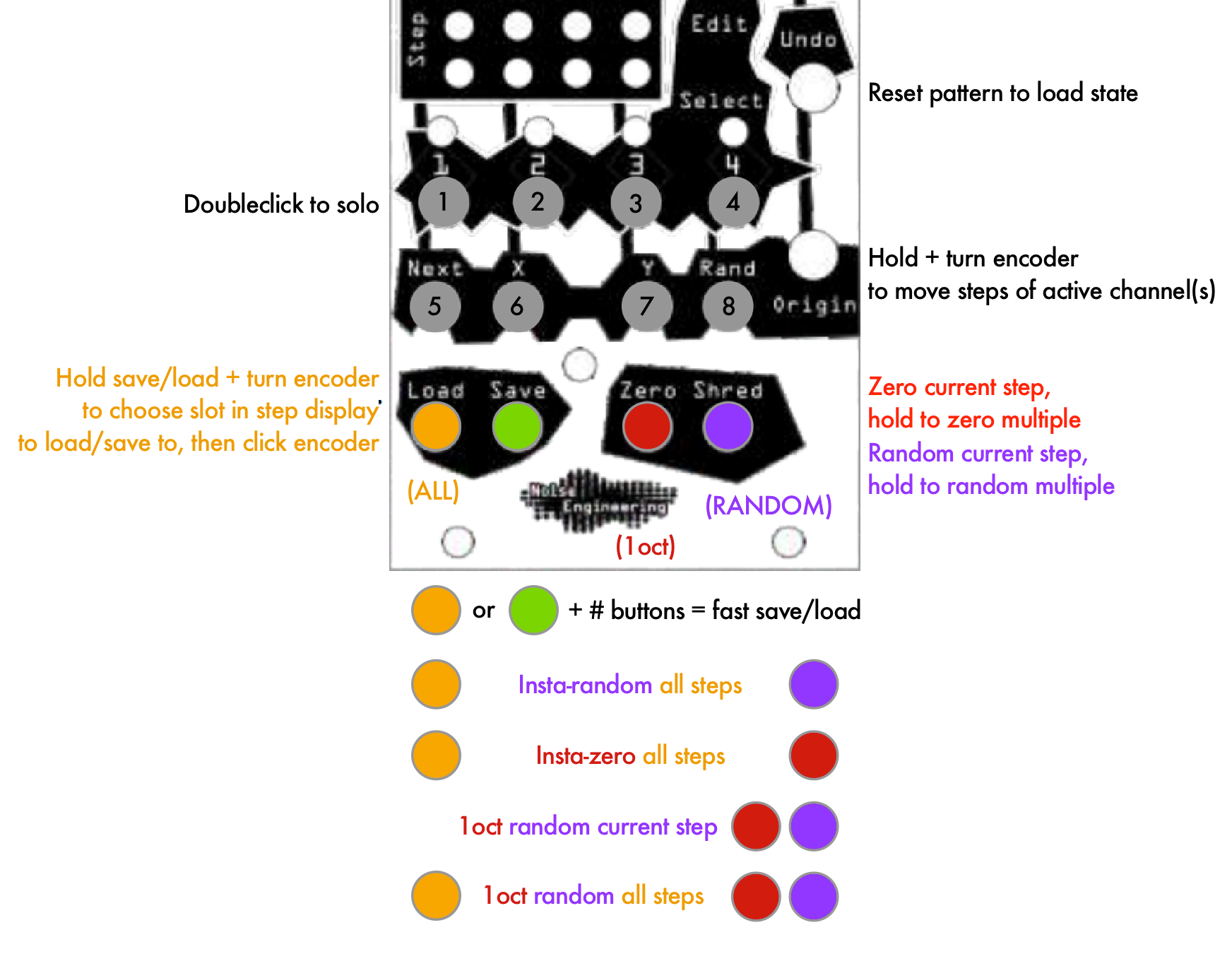 If you think of "Load" as "all", "Zero" as "restrict to 1 octave" the button combos are easier to remember. (I also keep needing to remind myself that "shred" means "random" and not "destroy".)