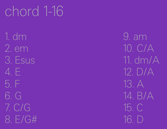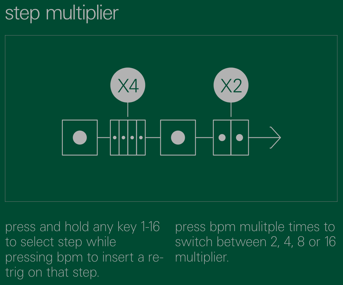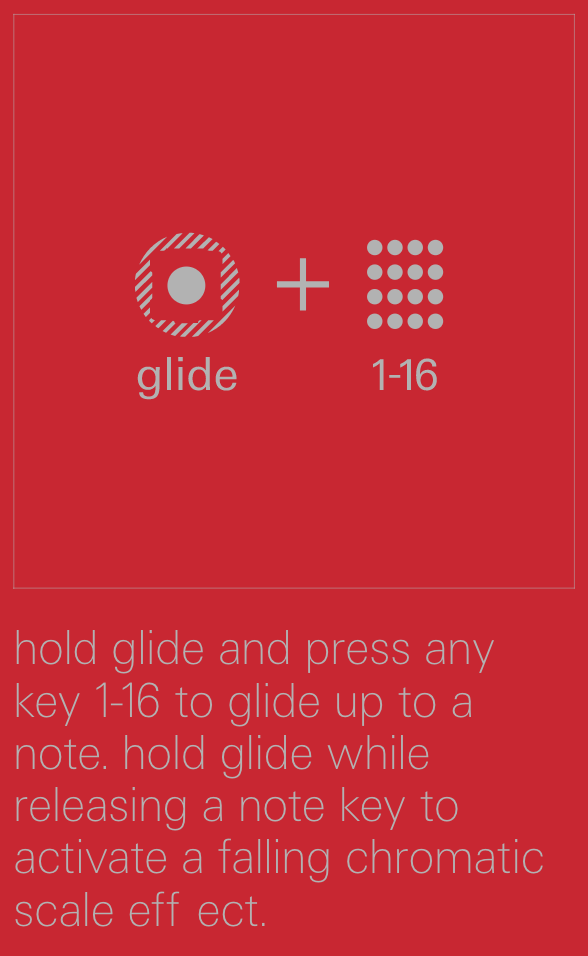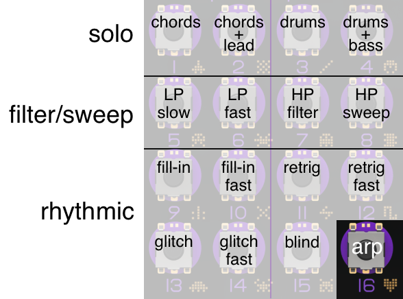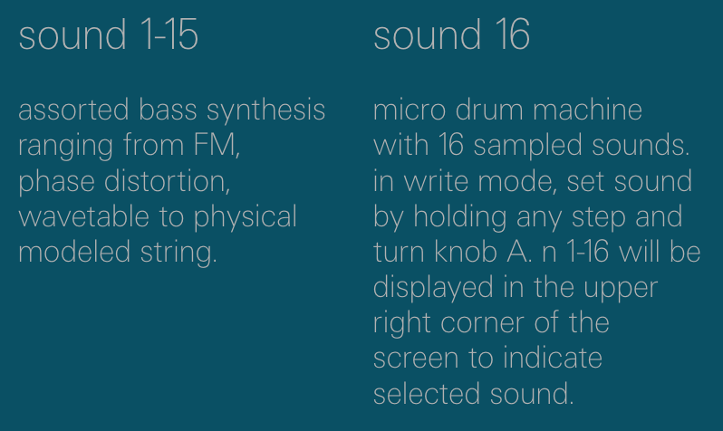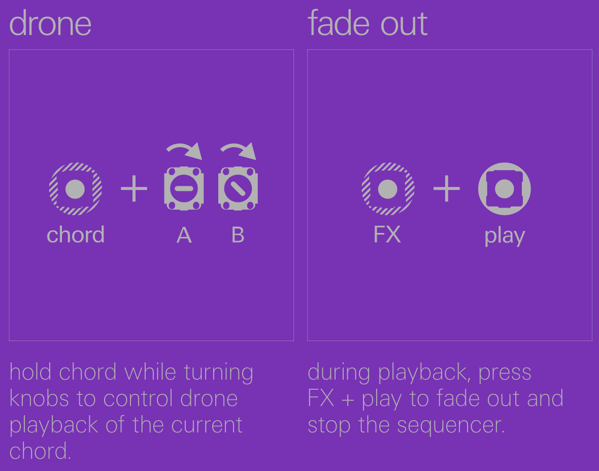 - Function key: chord chaining with drone (Funct + knob A = drone level, + knob B = sidechain) This affects the bass and chord sounds, and the arp effect.