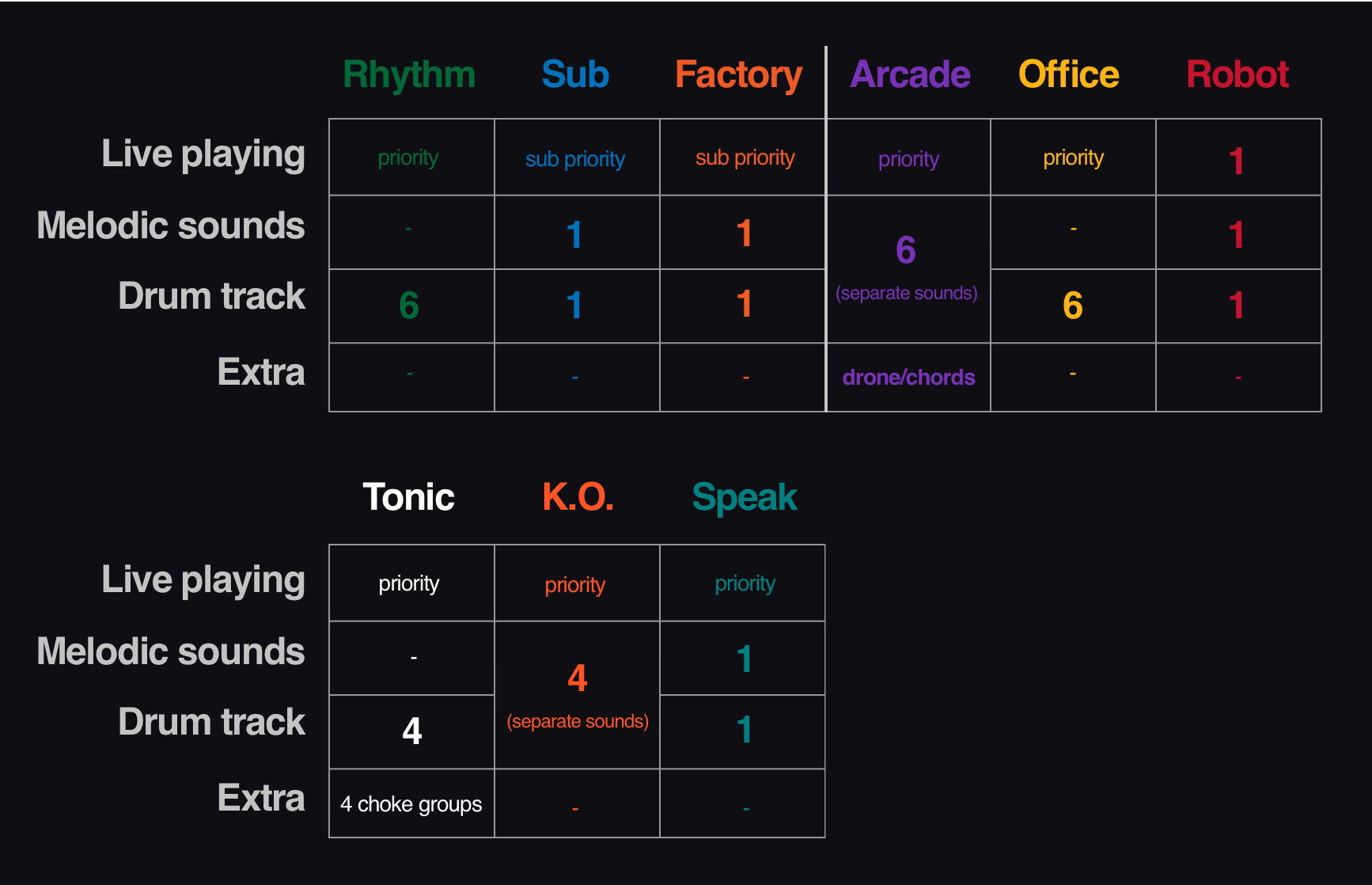 - Drums: Rhythm, Office, Tonic, (Arcade sort of)
