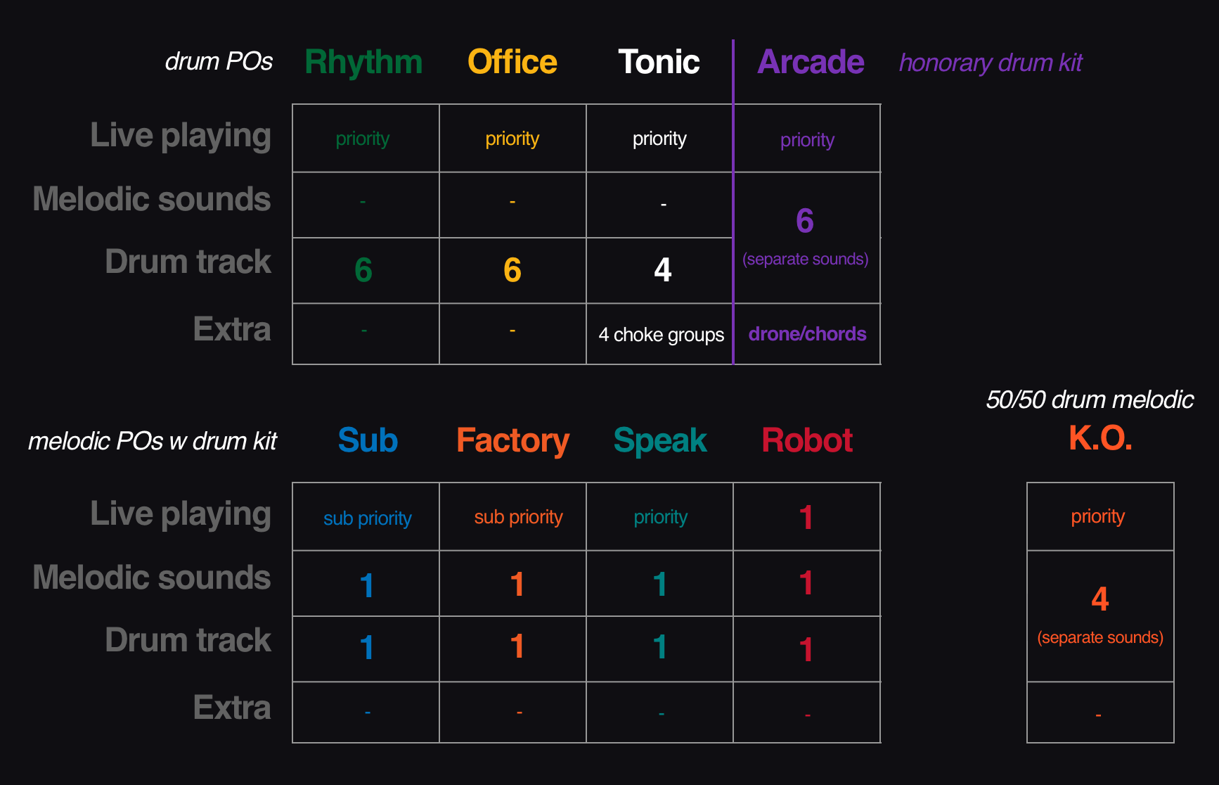 - POs with both melodic sounds and a micro drum machine: Sub, Factory, Robot