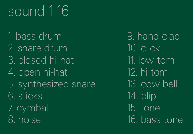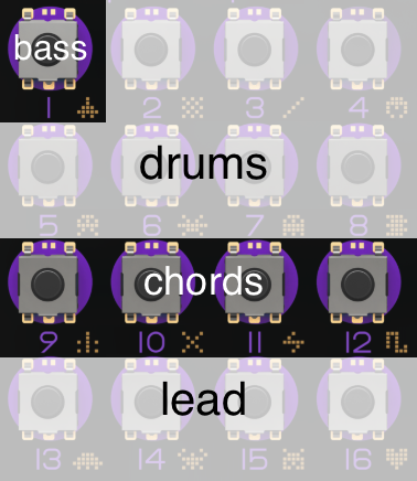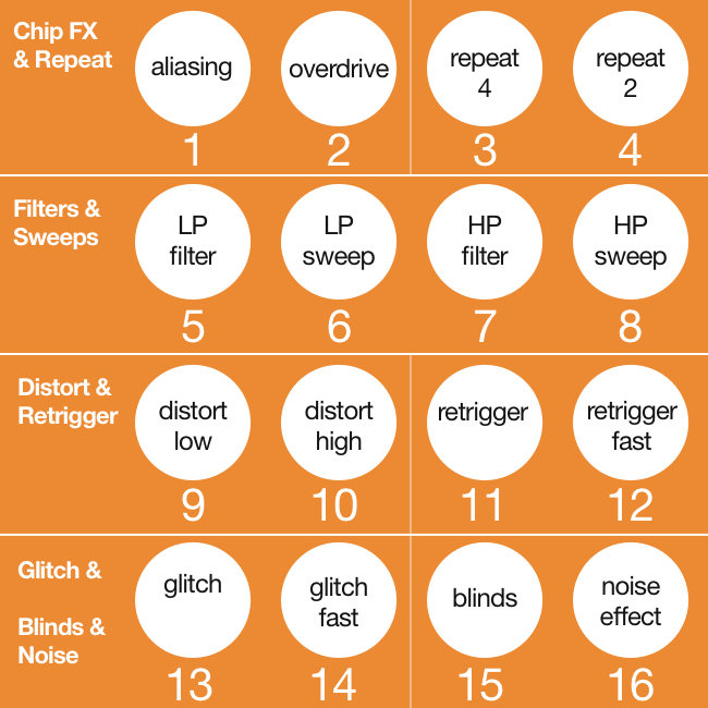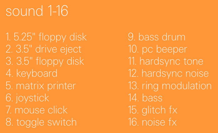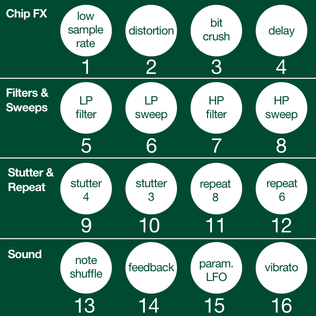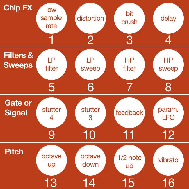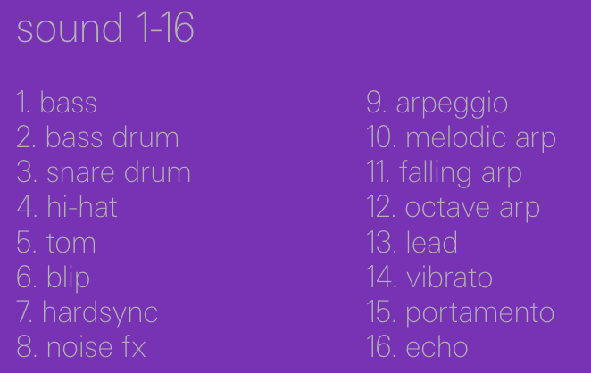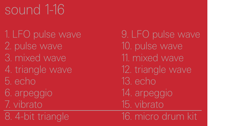 - The top two and bottom two rows are the same sounds but in a higher or lower octave, except that 8 = a sort of bass-like 4-bit triangle sound and 16 is a micro drum kit.