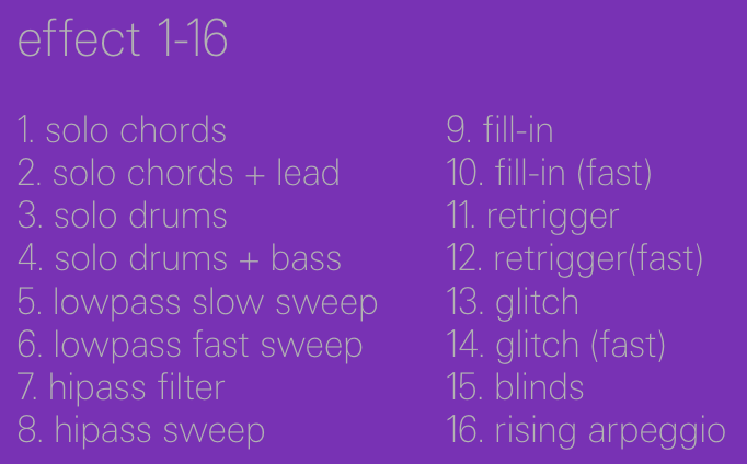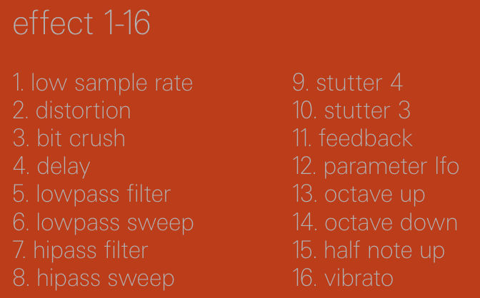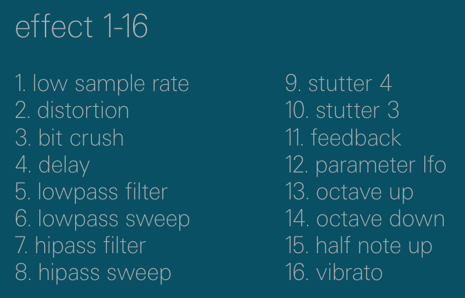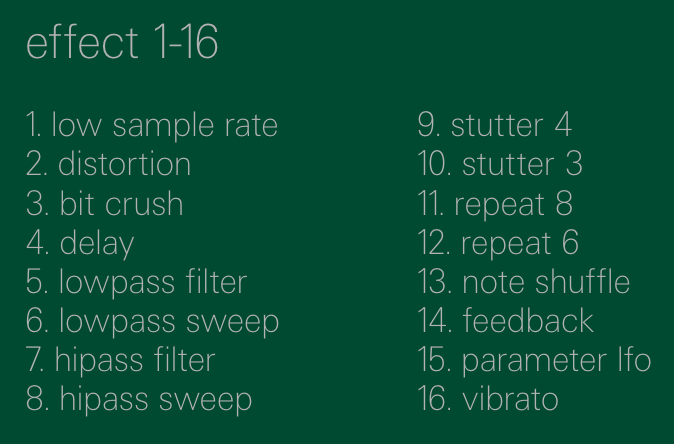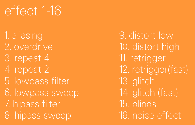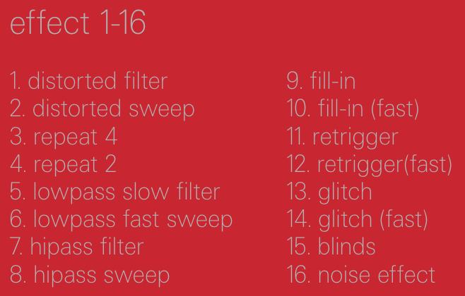 - first 1-10 effects identical to Sub and Factory. 11-15 unique to Rhythm.