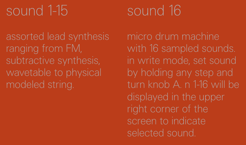 One restriction this creates is that when you select a sound, you don't get a scale across all the buttons. It works like a drum kit where each button is still a different sound. If you want to play different notes with one of the sounds, you either have to program it in step-by-step by holding a step with the sound on it (when that sound is active, the sequence is playing, and record is on) and turning knob A for pitch, or (while playing) hold record while turning knob A to fluidly change the pitch of all instances of a currently active sound in the sequence live. This is exactly how the Rhythm works as well, which means you can think of Arcade as a kind of a weird mutant drum kit PO.