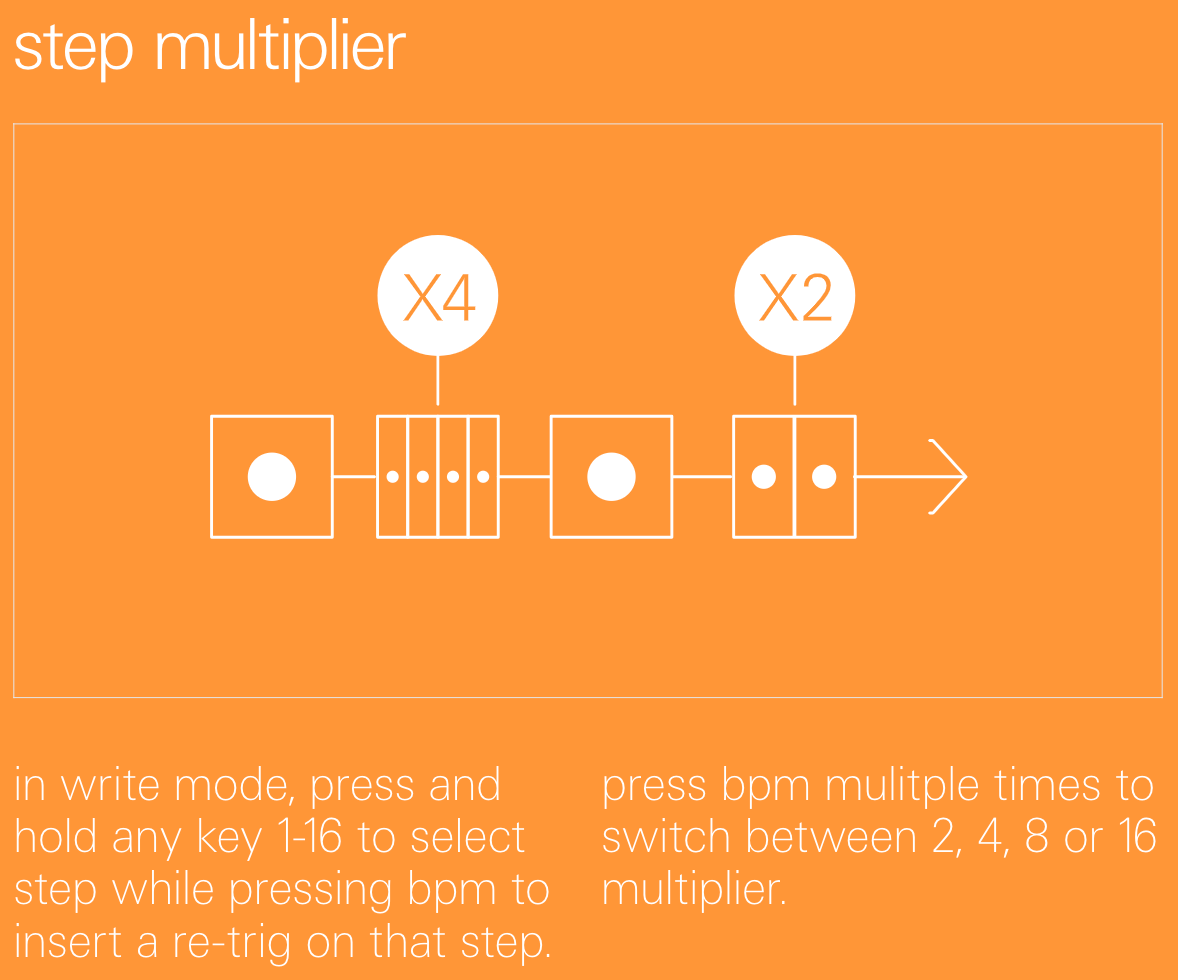- hold write while playing and turn A and B knobs to record automated sound parameter changes, including pitch.