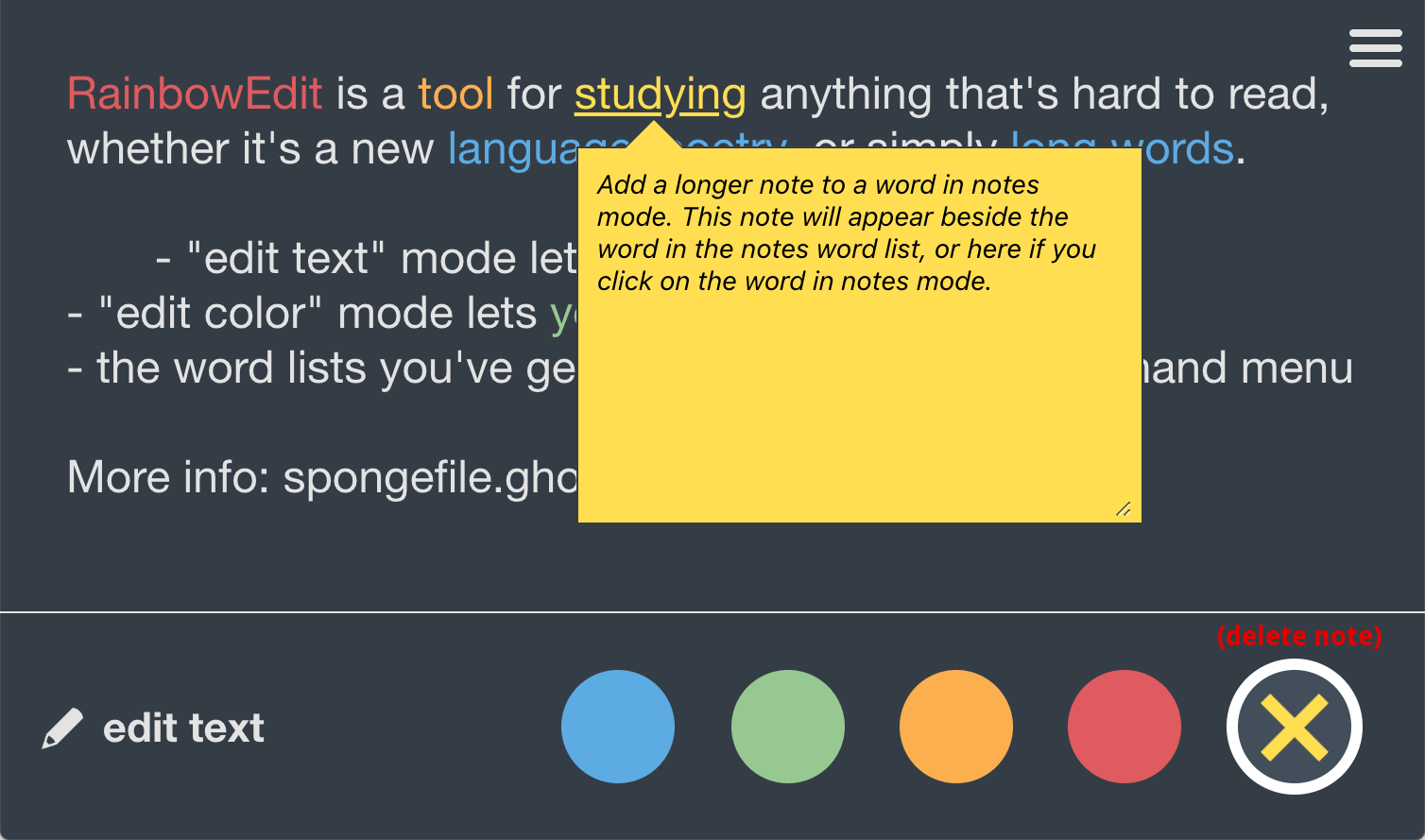 - To see lists of words in a particular color, click on the top right menu icon to see and edit them