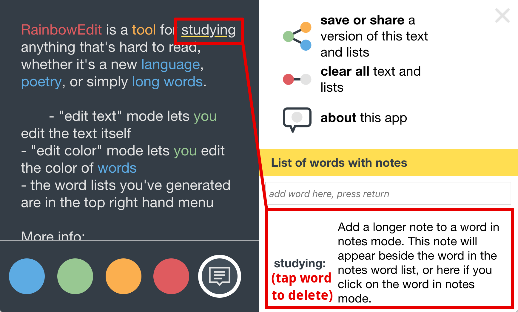 - Notes. Click on words in notes mode to add notes to them. The note will appear beside the word in the Notes word list, or if you click on an underlined word in Notes mode.