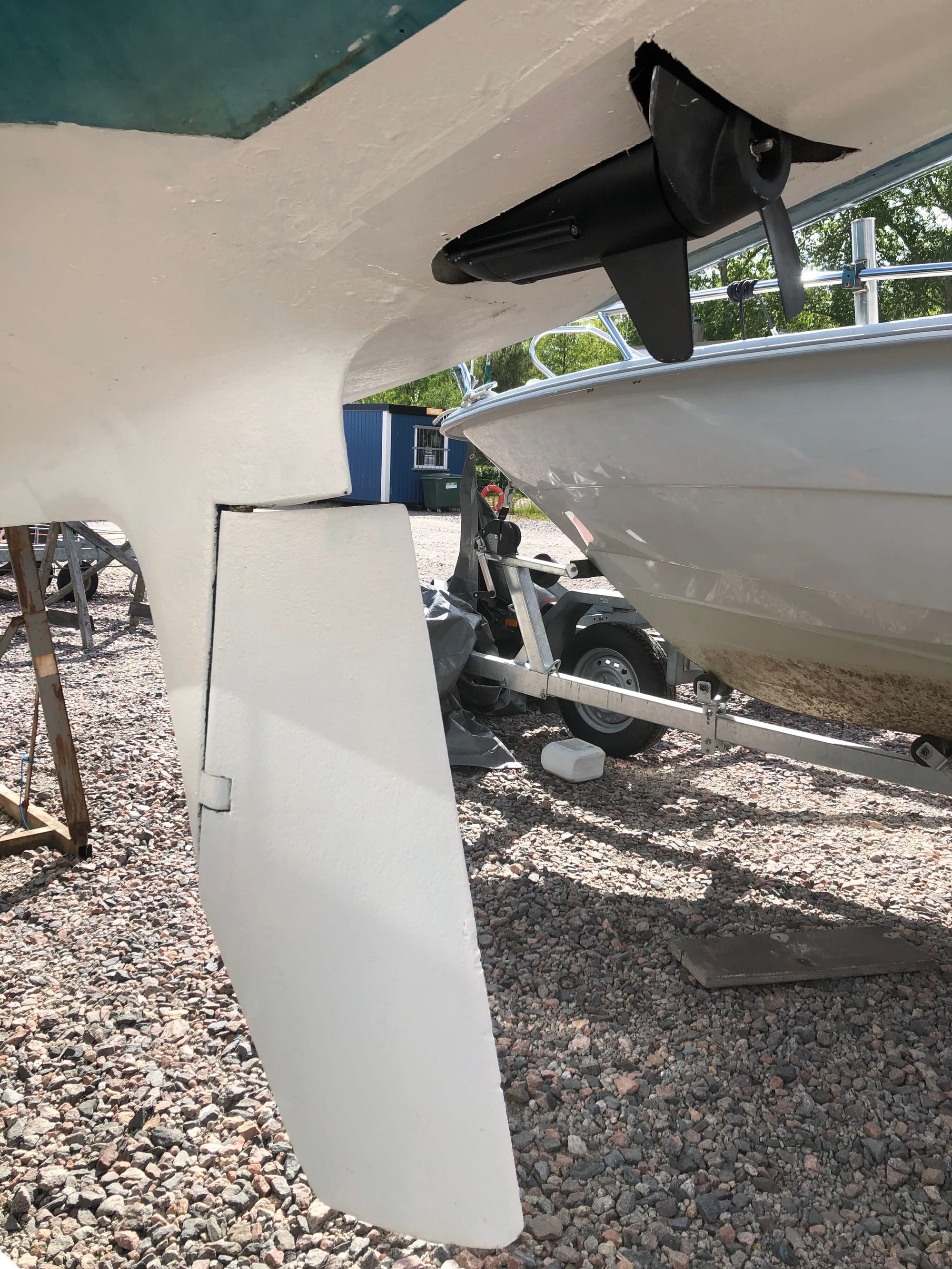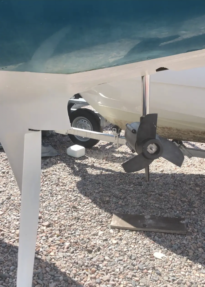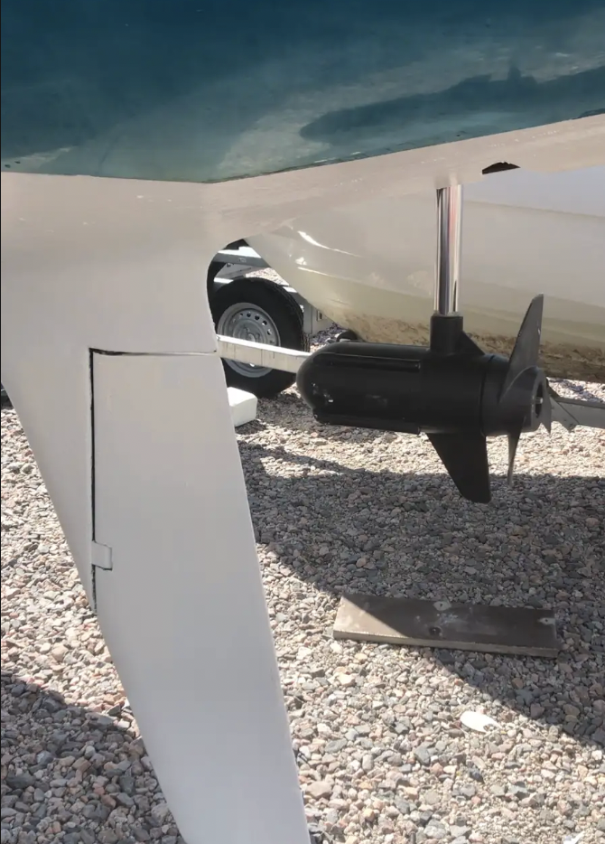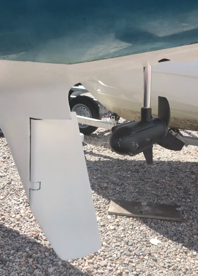 The motor is stored in harbor and while sailing in a watertight and sturdy housing recess built into the hull.
