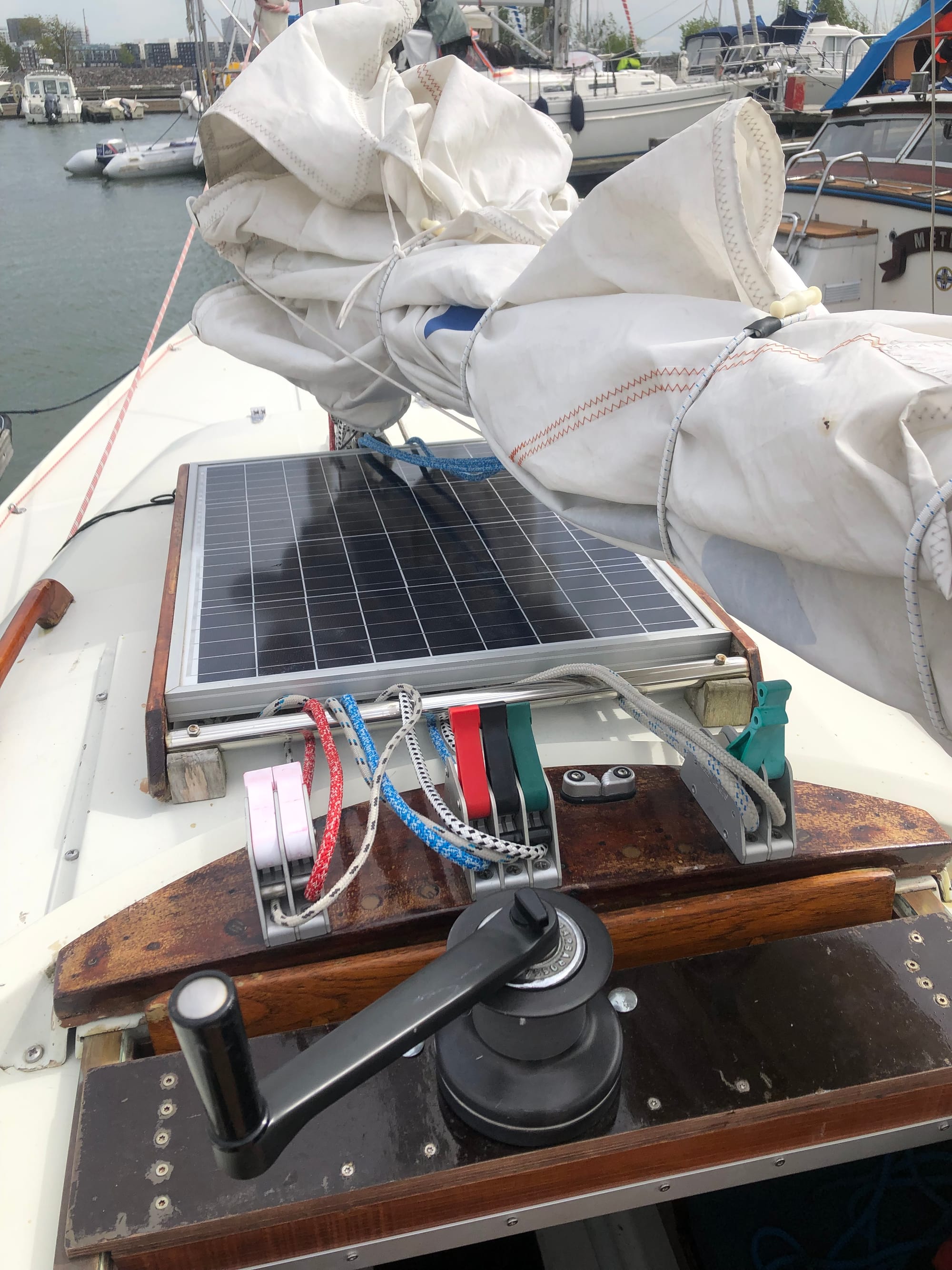 The solar panel is hinged at the front edge and serves as a "rope storage" in harbor where ropes are protected from sunlight. The rigging runs under the panel.
