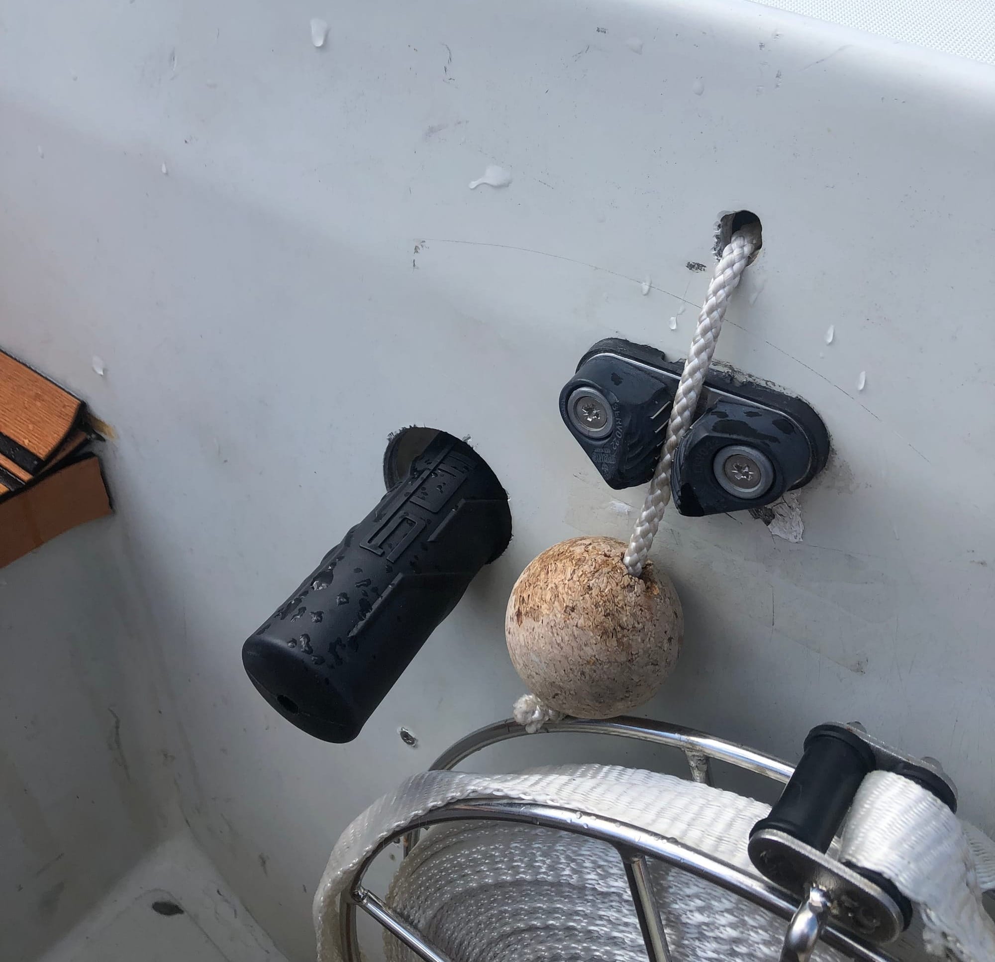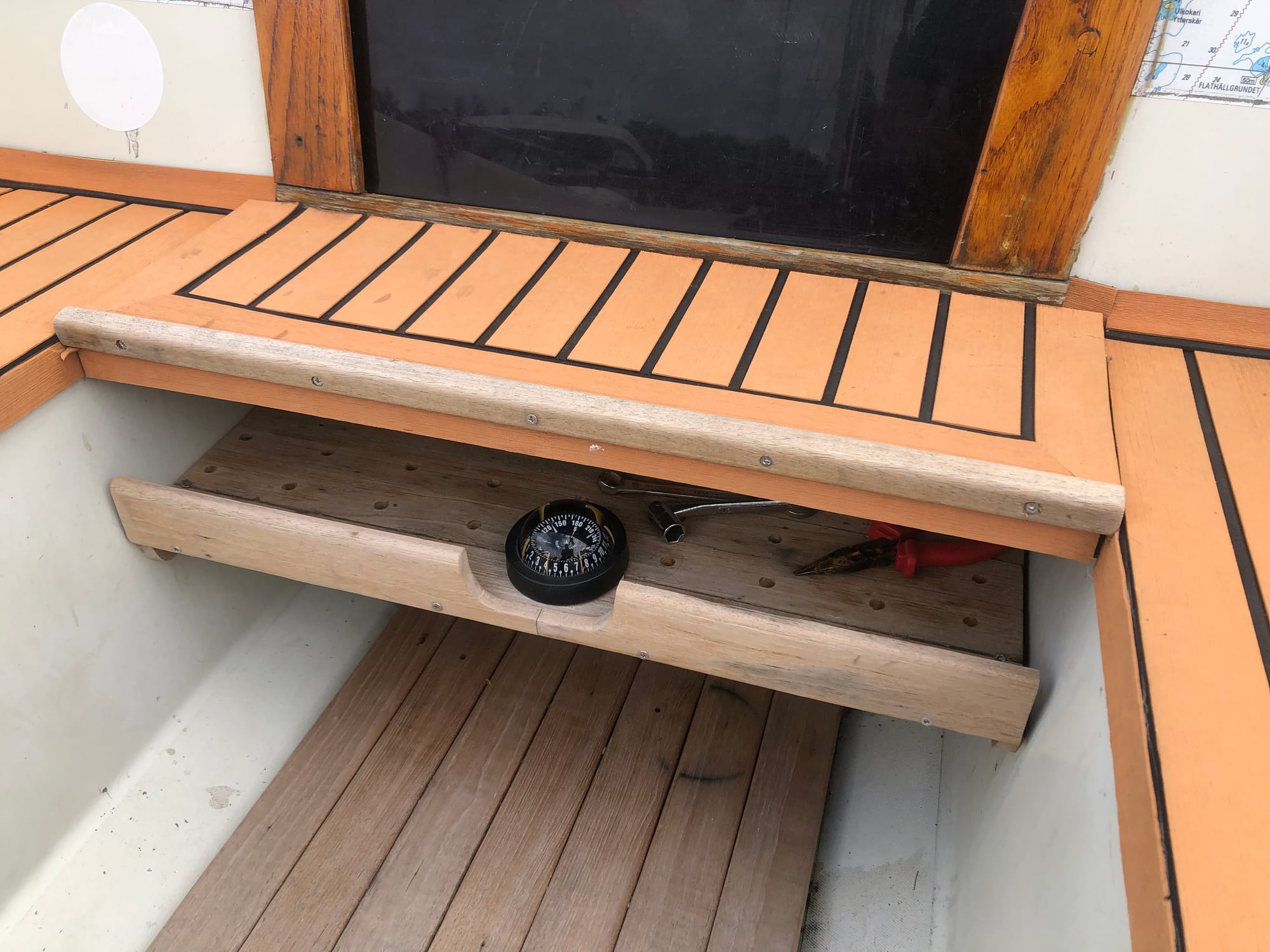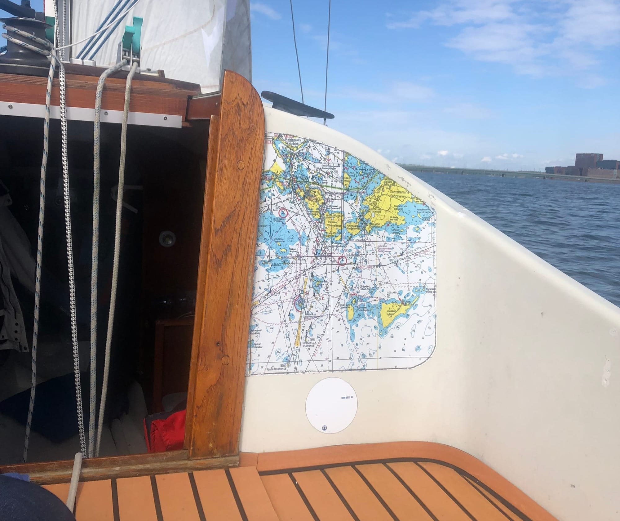 On both sides of the cabin hatch, laminated plastic sea charts are installed for day sailing.
