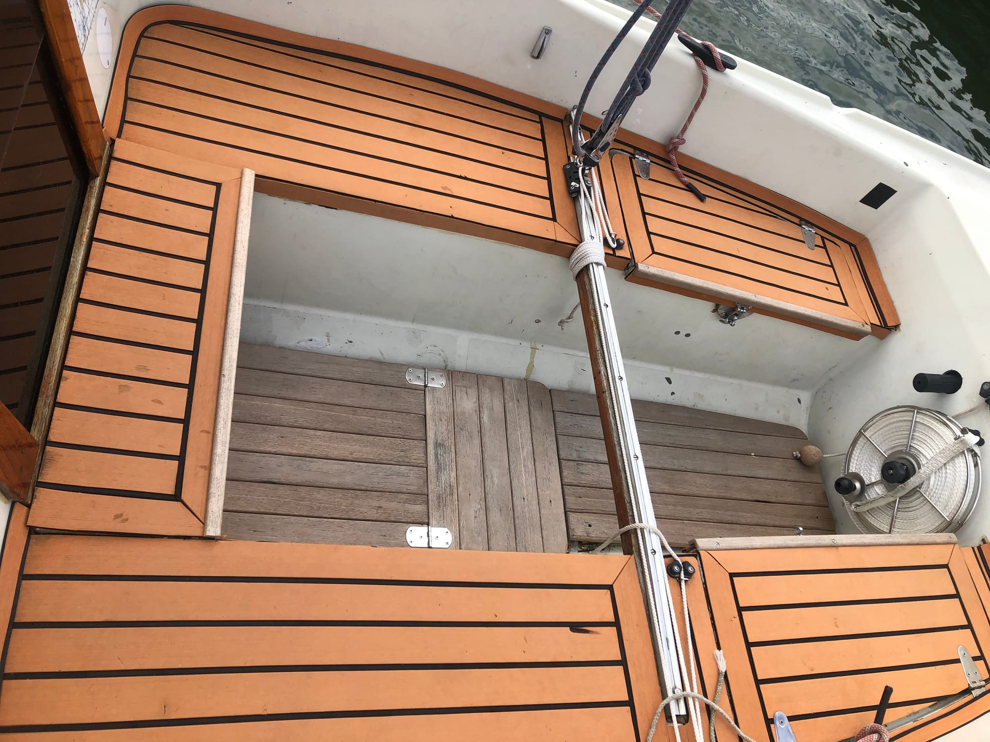 The cockpit is covered with synthetic teak, grating made in three sections. Under the hinged center hatch are the cockpit drain holes, so their operation is easy to monitor and clean.